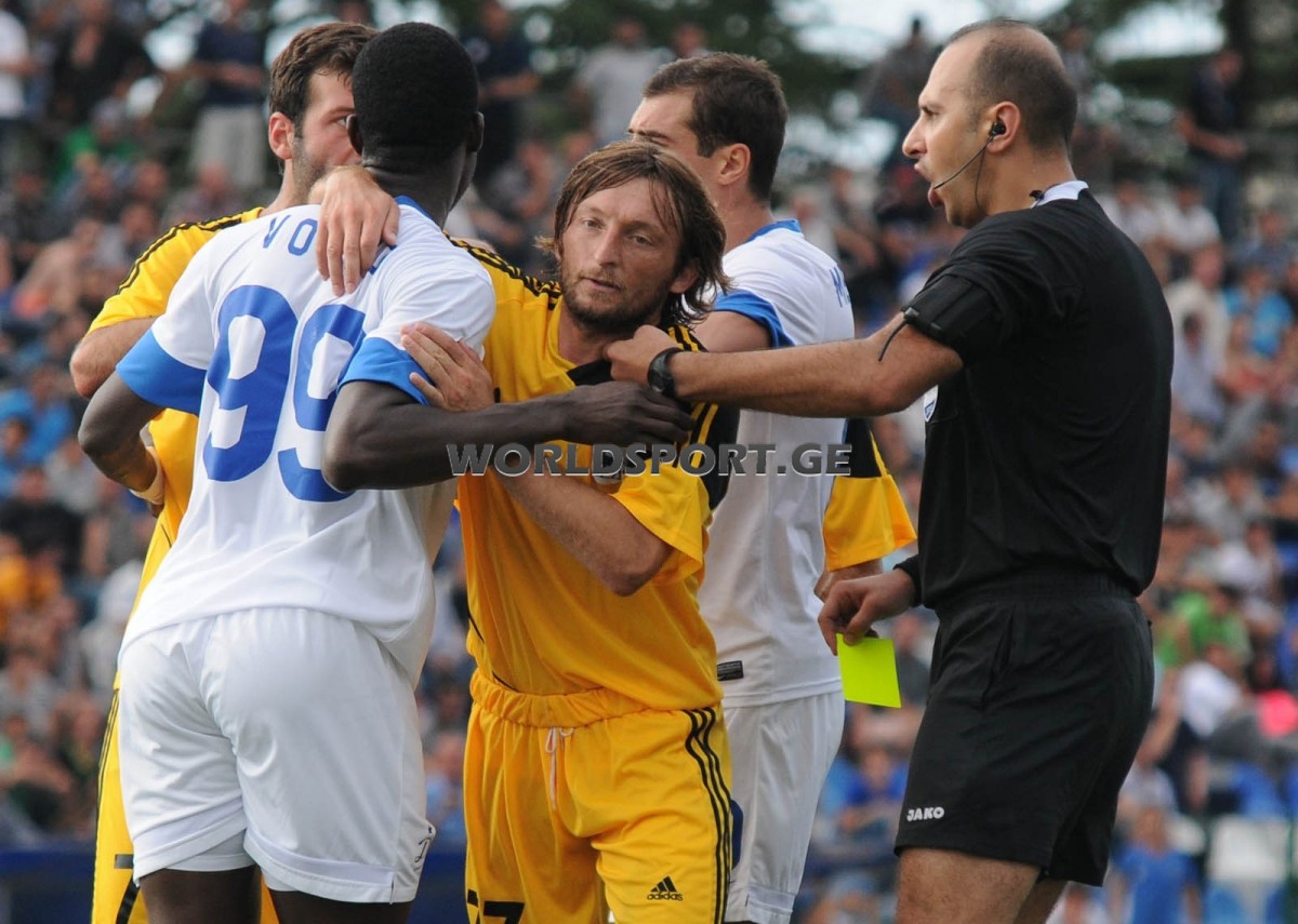 35-ე წუთზე მოედანზე ერთობ საჩოთირო სიტუაცია შეიქმნა. ,,მასპინძელთა” მორიგი შეტევის დროს ერთ-ერთ დინამოელს ბურთი ხელზე შეეხო. გურულები პენალტის დანიშვნას კიდევ ერთხელ მოითხოვდნენ. განსაკუთრებულ პრეტენზიას ისინი ასისტენტ მენთეშაშვილის მიმართ გამოთქვამდნენ. საქმის გარჩევაში გურულთა კლუბის ხელმძღვანელობაც ჩაერთო, ხოლო ერთ-ერთმა წარმომადგენელმა ასისტენტს ფიზიკური შეურაცხყოფაც მიაყენა. როგორც მატჩის შემდეგ დავადგინეთ, მსაჯებმა გუნდის ადმინისტრატორ გოჩა იმნაიშვილს ბარათი ჩამოართვეს და ფედერაციაში წაიღეს.