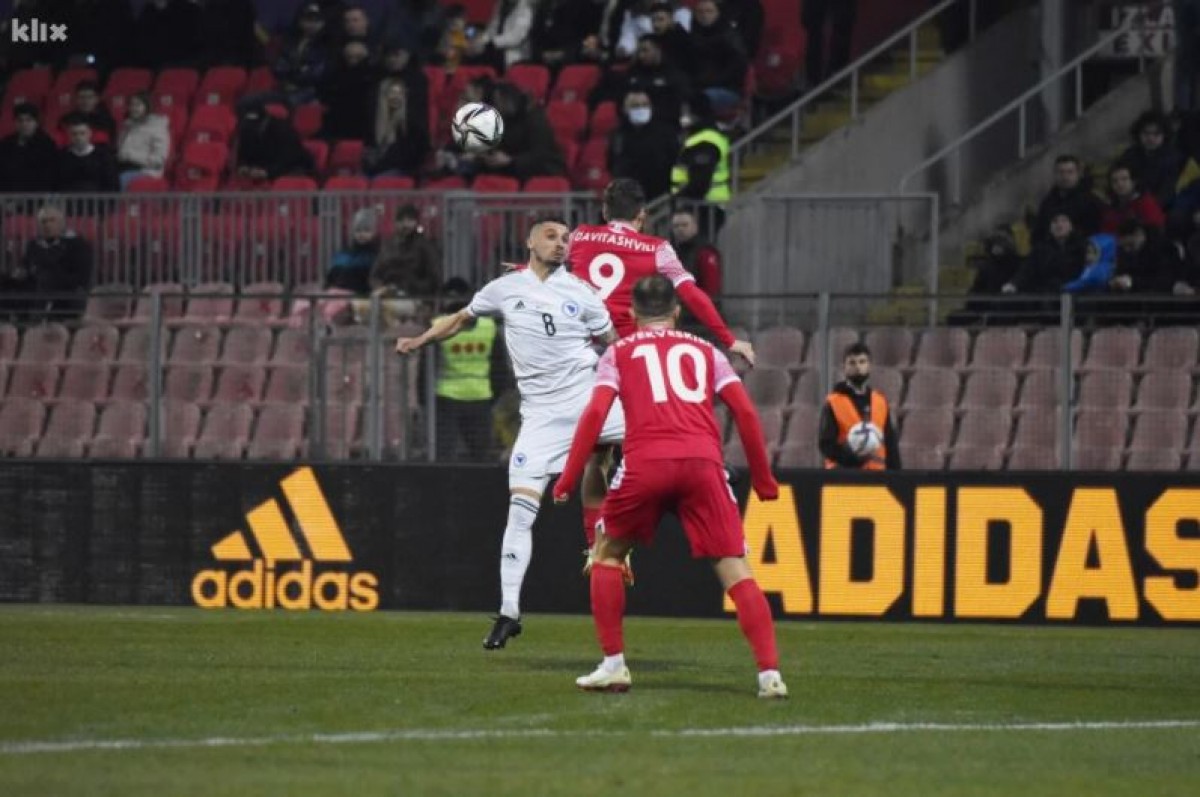 მატჩს ორი განსხვავებული ტაიმი ჰქონდა: პირველში ბოსნიელთა უპირატესობა აშკარა იყო და სამი რეალური მომენტიც შექმნეს. ადნან კოვაჩეჩიმა ძელს გაარტყა, ერმედინ დემიროვიჩმა გიორგი ლორიასთან პირისპირ დარჩენილმა კარს ააცილა, ხოლო ედინ ჯეკოს ქართველმა მეკარემ აჯობა. ამასთან თამაშგარის გამო კოვაჩევიჩს გოლი არ ჩაუთვალეს.