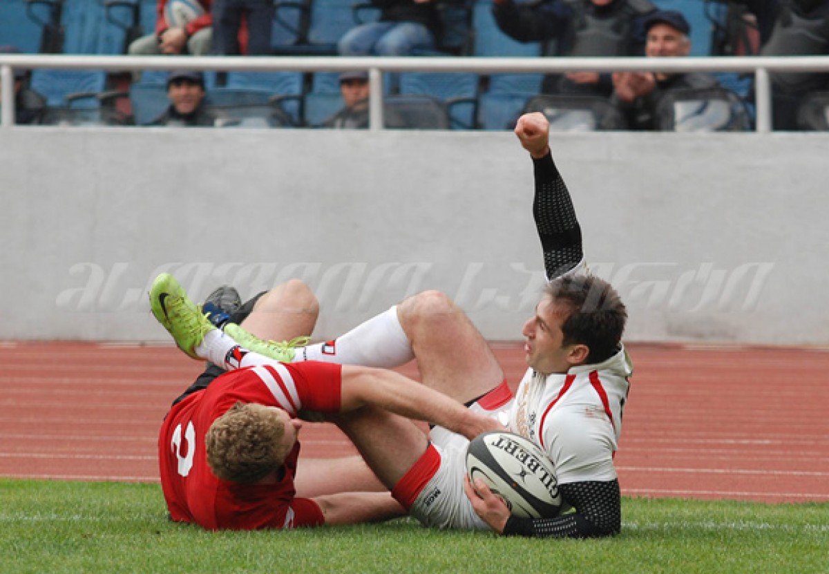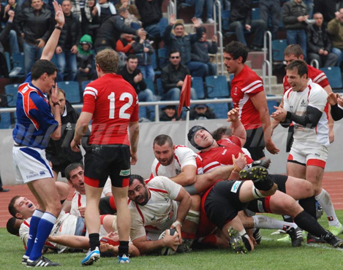 Hosts advanced with the first try which was scored by Malaghuradze in average distance at the beginning of the match and then their attack became more active. Canadians stopped opponent’s attack several times but finally they were punished with tactic try, Malaghuradze realized well 10:0.