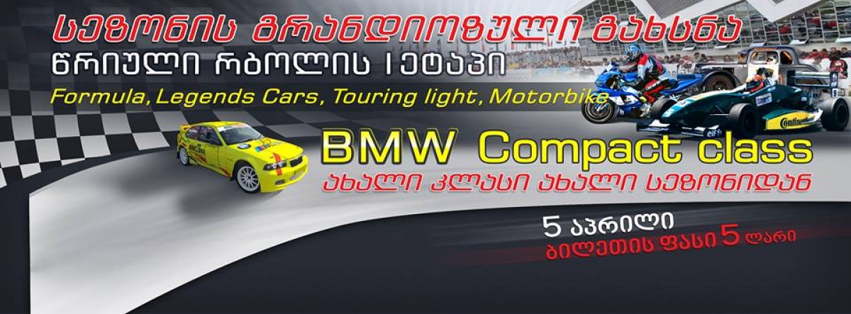კვირას, 5 აპრილს, რუსთავის საერთაშორისო ავტოდრომზე საქართველოს ჩემპიონატი წრიულ რბოლაში ოფიციალურად იხსენება. რბოლები გაიმართება ხუთ სხვადასხვა კლასში - ფორმულა, ლეგენდა, ჰონდას თასი, მოტიციკლები და ახალი BMW Compact Cup.