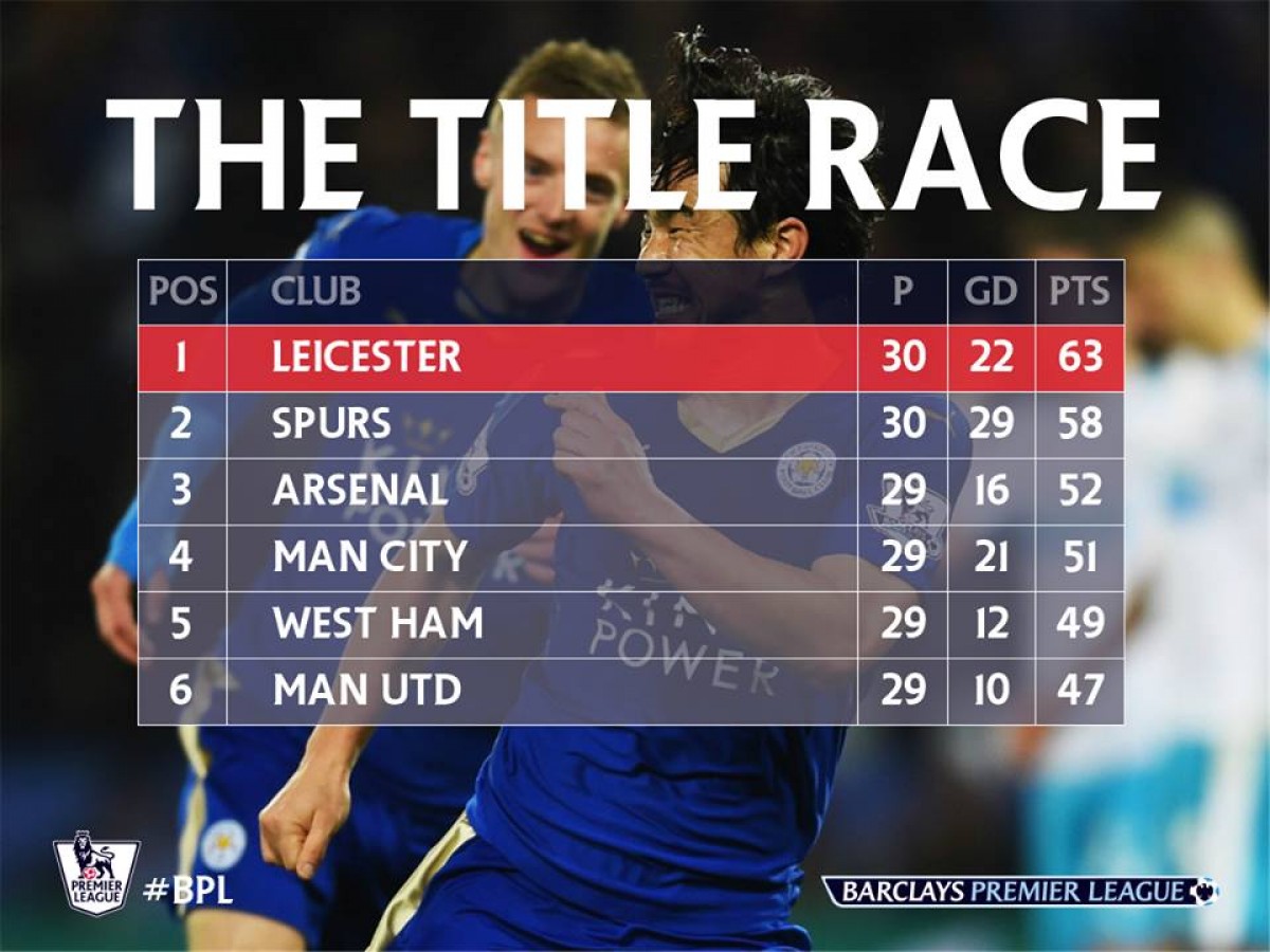 ჩემპიონატის დასრულებამდე 8 ტურით ადრე “ლესტერს“ 63 ქულა აქვს და უახლოეს მდევარს „ტოტენჰემს“ 5 ქულით უსწრებს.