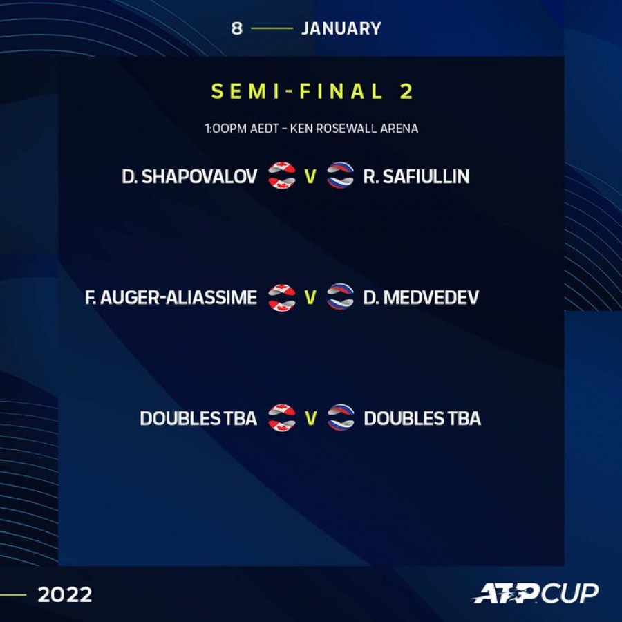 მეორე ნახევარფინალში ერთმანეთს რუსეთი და კანადა დაუპირისპირდებიან. ერთეულთა შორის წინასწარი განრიგით დენის შაპოვალოვი რომან საფიულინს შეხვდება, ხოლო ფელიქს ოჟე-ალიასიმე - დანილ მედვედევს.