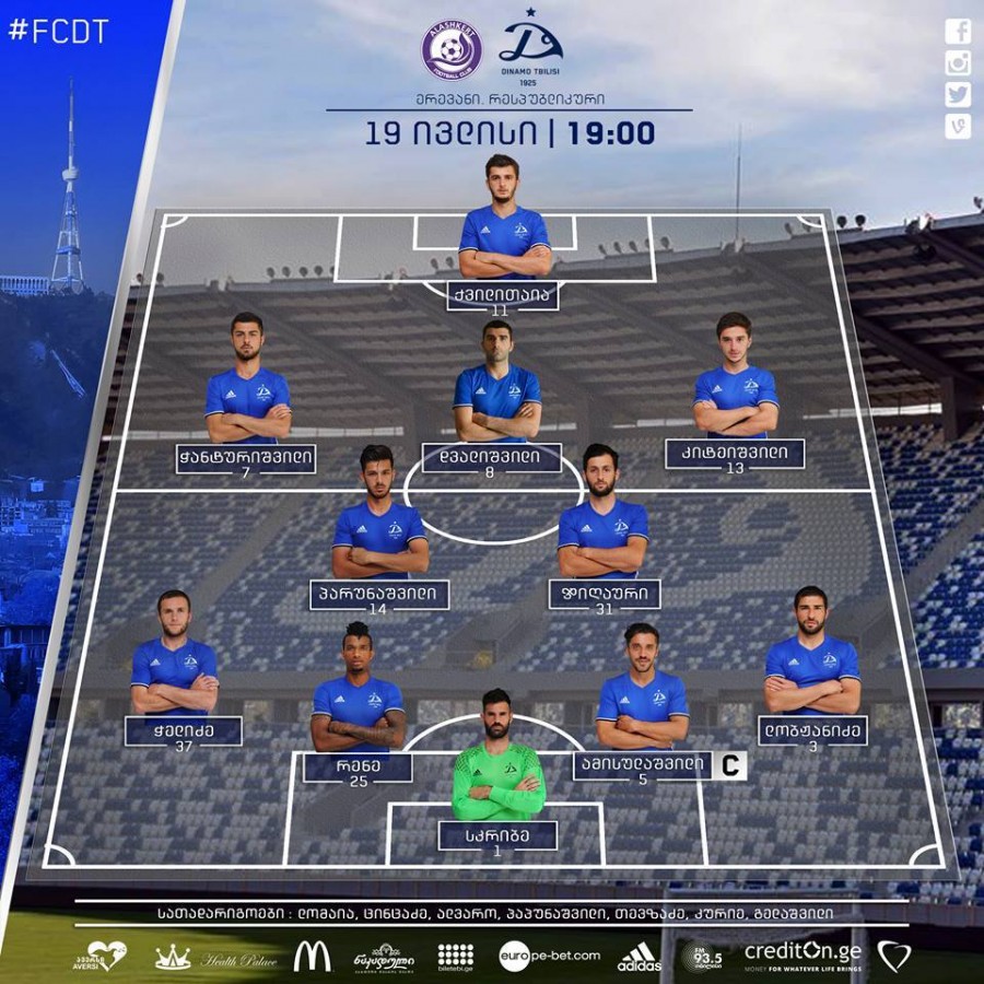 “Dinamo” (4-2-3-1): Scribe; Lobzhanidze, Amisulashvili, Renee Ferreira, Chelidze; Jighauri, Parunashvili; Kiteishvili, Dvalishvili, Chanturishvili; Kvilitaia.
