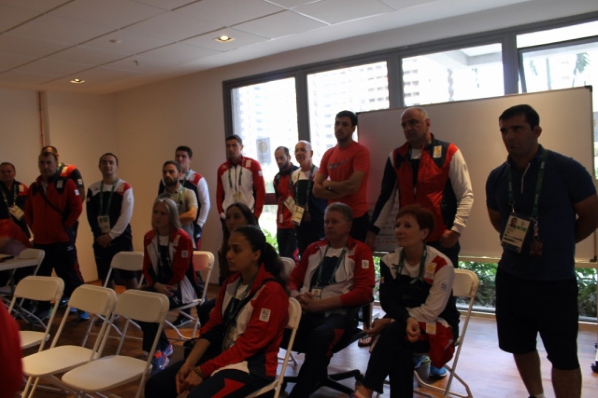 დღე კი იმით დაიწყო, რომ ოლიმპიურ სოფელს ესტუმრა და ქართველ ოლიმპიელებს შეხვდა ბრაზილიის ფედერაციულ რესპუბლიკაში საქართველოს საგანგებო და სრულუფლებიანი ელჩი ოთარ ბერძენიშვილი. მას თან ახლდნენ საელჩოს თანამშრომლები – კოტე საბიაშვილი და ლუკა აბშილავა. საქართველოს ოლიმპიური მისიის ხელმძღვანელმა ელგუჯა ბერიშვილმა სტუმრებს წარუდგინა ჩვენი სპორტსმენები, დელეგაციის სხვა წევრები.