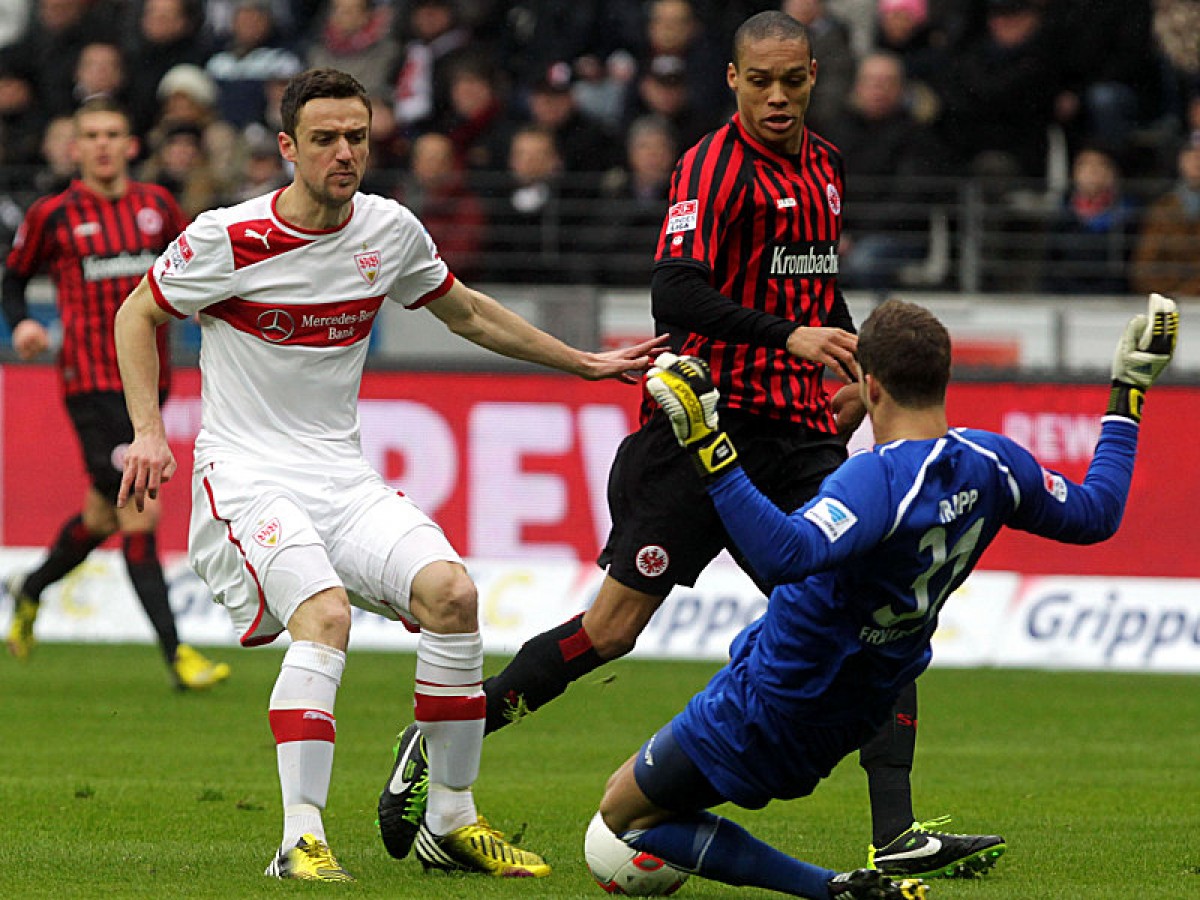 მე–17 წუთზე, პირმინ შვეგლერის ბრწყინვალე პასის შემდეგ, შტეფან აიგნერი მეკარესთან პირისპირ დარჩა და ისღა დარჩენოდა, ბურთი ერთი შეხებით მოეთავსებინა სტუმართა კარში. ფრანკფურტელებმა მეტოქის იერიშებს პირველ ტაიმში გაუძლეს, მაგრამ მოსახდენი დასკვნით 45 წუთში მოხდა – 49–ე წუთზე, ვედად იბიშევიჩმა თერთმეტმეტრიანით გაათანაბრა ანგარიში და შტუტგარტელებს ფსიქოლოგიური უპირატესობა მოუტანა.