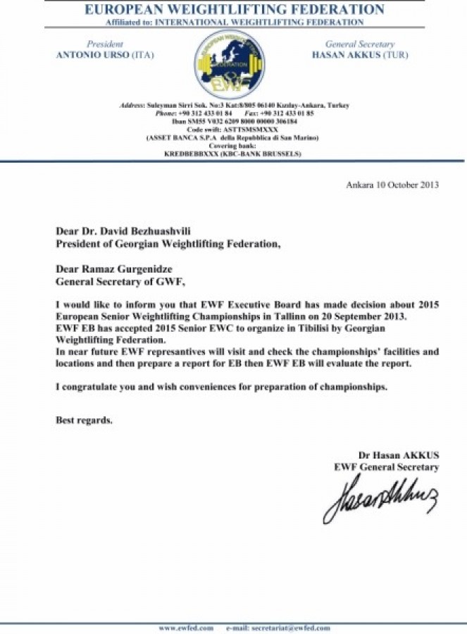 Федерация тяжёлой атлетики Европы доверила проведение первенства континента Тбилиси. Об этом Федерация тяжёлой атлетики Грузии уже получила поздравительное письмо.